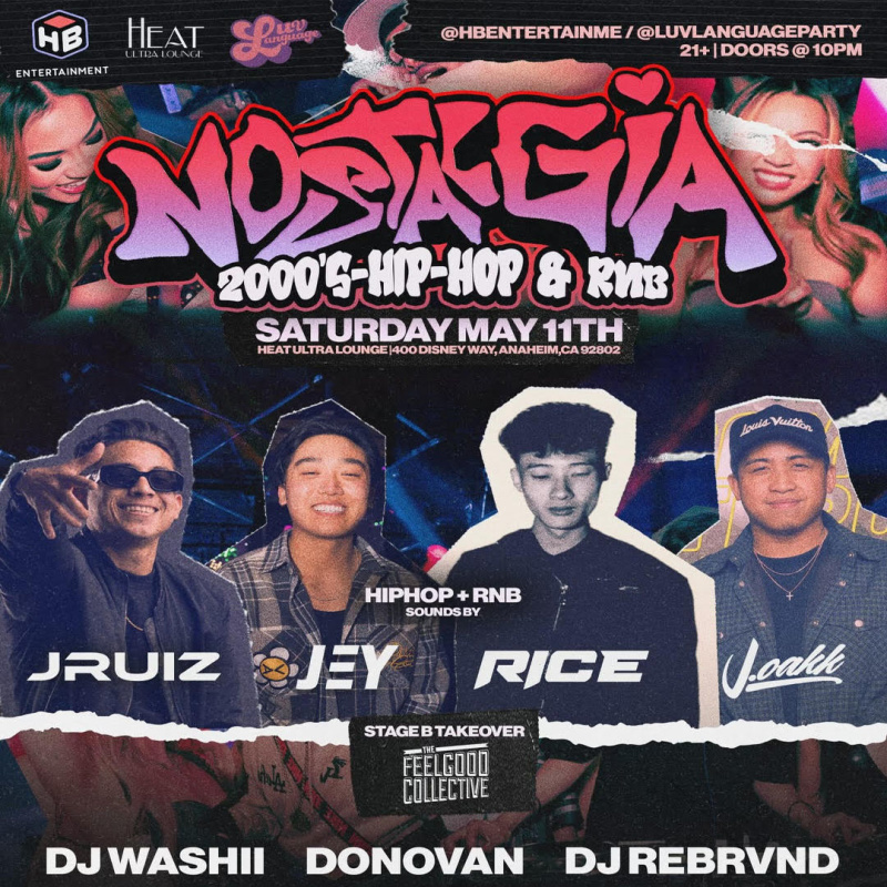 Nostalgia Party Is Back In Orange County Saturday May 11th. Experience So Cal's Ultimate Saturday Night Party Special Guest DJ's JRuiz, JEY, Rice and J. Oakk In The Mix! Second Room Takeover By The Feelgood Collective DJ's WASHII, Donovan and Rebrvnd.